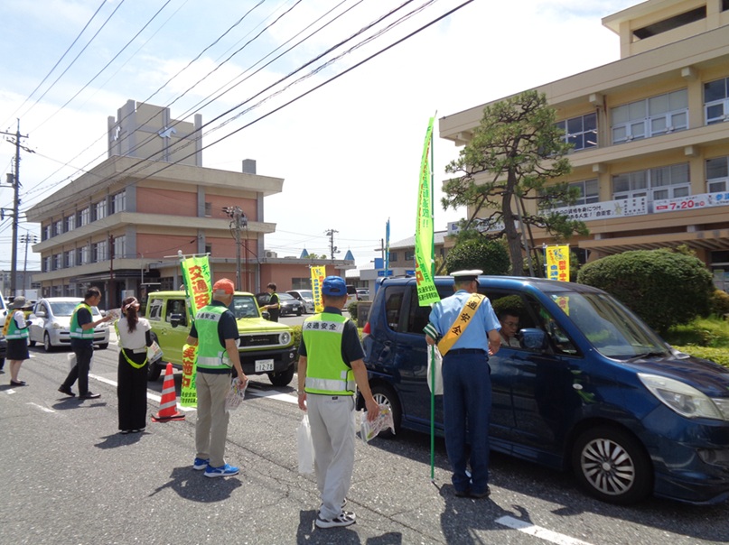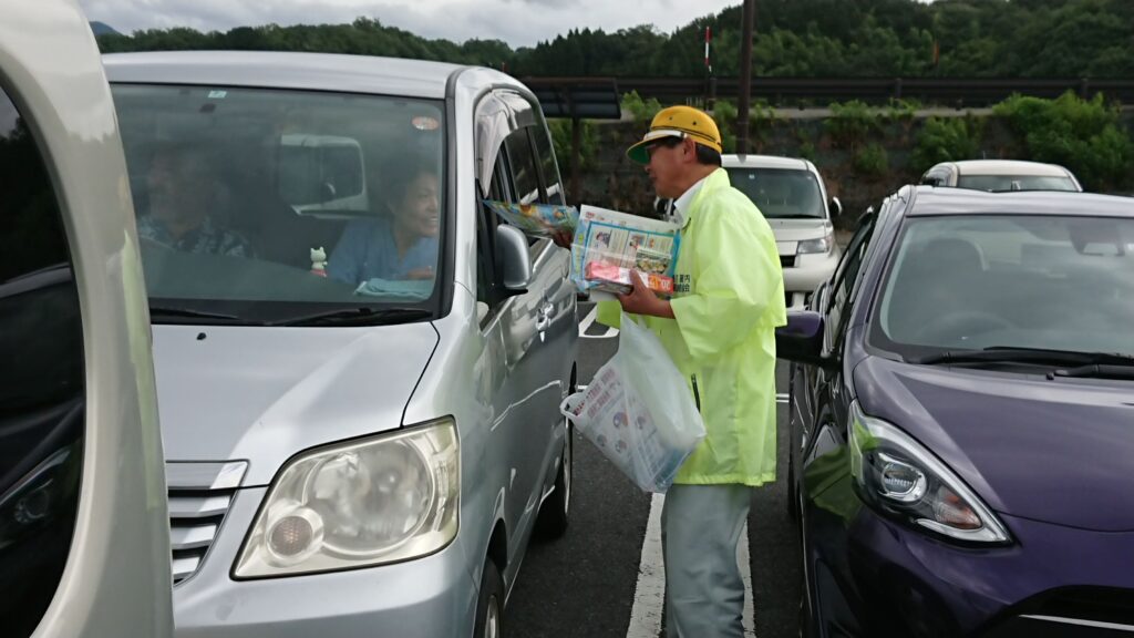 智頭地区協議会(山本洋敬会長)では、各季交通安全運動に際し、通行車両等を対象に交通安全啓発のチラシやグッズを配布し交通安全運動の周知及び、安全運転の実践や交通ルールの遵守を呼び掛ける活動を行っています。