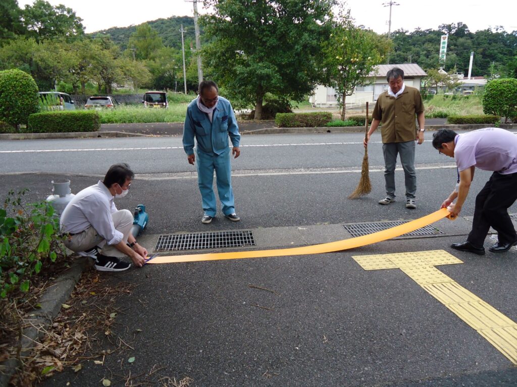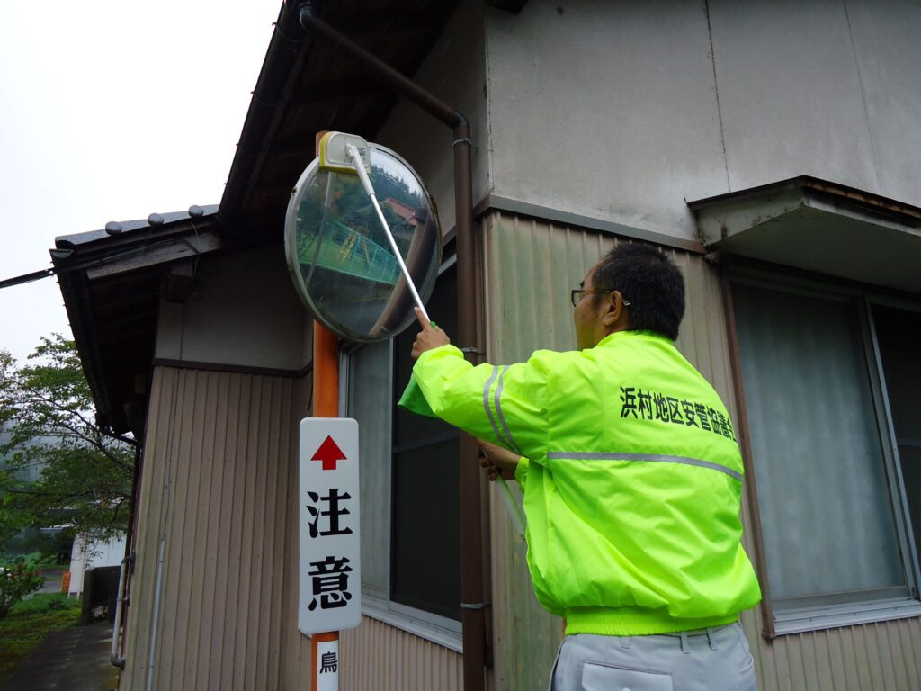 浜村地区協議会(小谷英明会長)の青年部では、地域に貢献する事業の取組として、出合頭事故の防止を図るため地区内のカーブミラー清掃活動を毎年行っています。また、事業所の要望に応じて駐車場出口などに停止線を設置する事業も行っています。