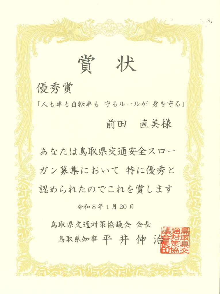 最優秀作スローガン「ゆずりあう あなたの気持ちが 事故減らす」は令和8年度から12年度の5年間(第12次鳥取県交通安全計画の推進期間)、交通安全県民運動のポスターやチラシ等に掲載するなどして、各種広報啓発に 使用されるということです。